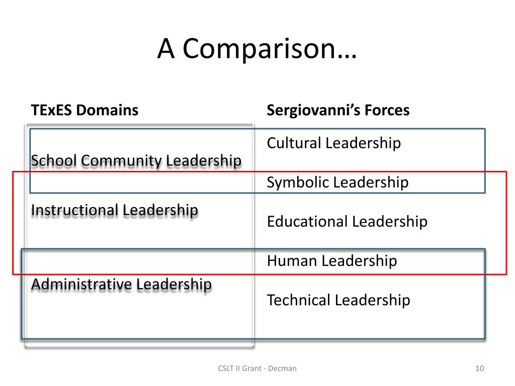 CSLT II Grant J. Decman, Ed. D. Overview. The Way It Ought To Be. TExES Domain 1: School Community Leadership. TExES Domain 2: Instructional Leadership. TExES Domain 3: Administrative Leadership. Serviovanni’s Leadership Forces. Five Forces. What About the forces?. A Comparison….
