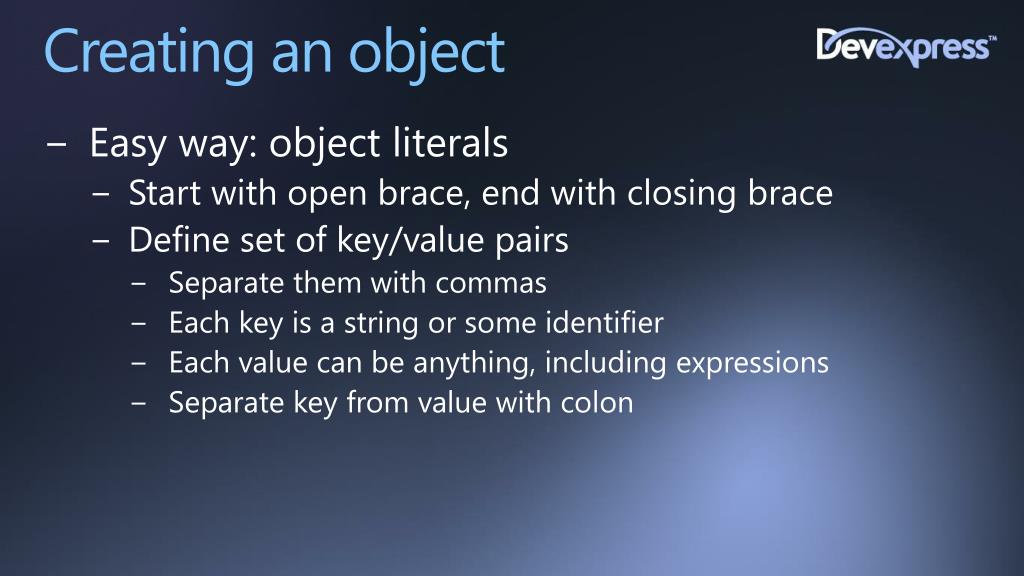 Creating an object • Easy way: object literals • Start with open brace, end with closing brace • Define set of key/value pairs • Separate them with commas • Each key is a string or some identifier • Each value can be anything, including expressions • Separate key from value with colon