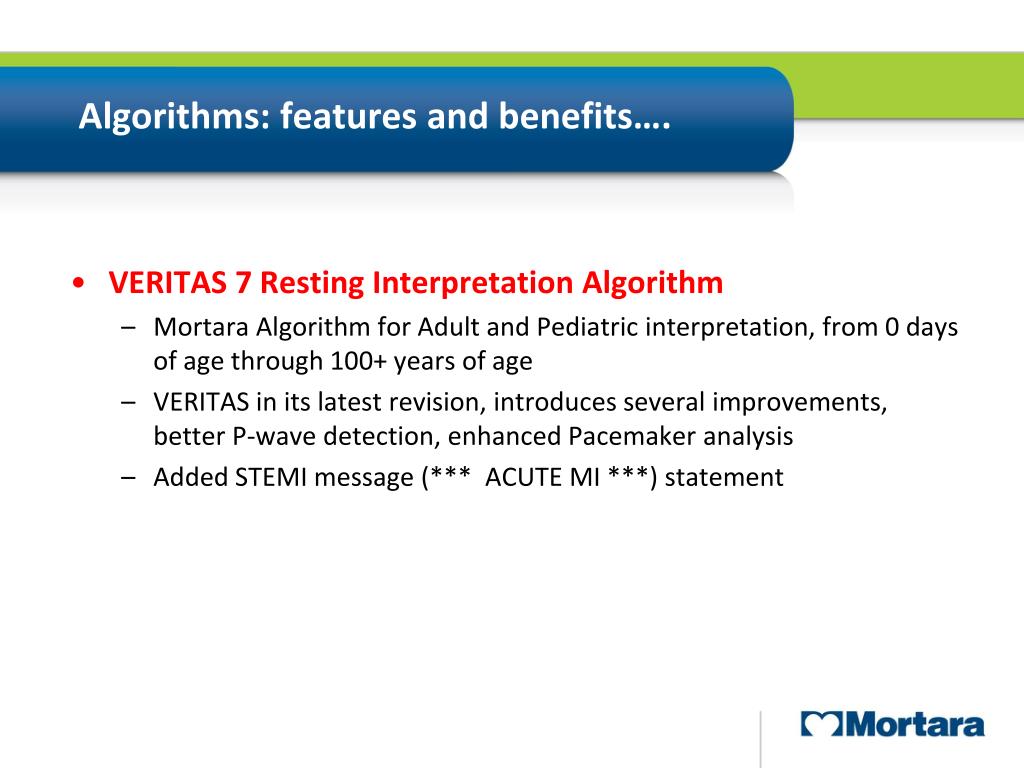 Algorithms: features and benefits…. • VERITAS 7 Resting Interpretation Algorithm • Mortara Algorithm for Adult and Pediatric interpretation, from 0 days of age through 100+ years of age • VERITAS in its latest revision, introduces several improvements, better P-wave detection, enhanced Pacemaker analysis • Added STEMI message (*** ACUTE MI ***) statement