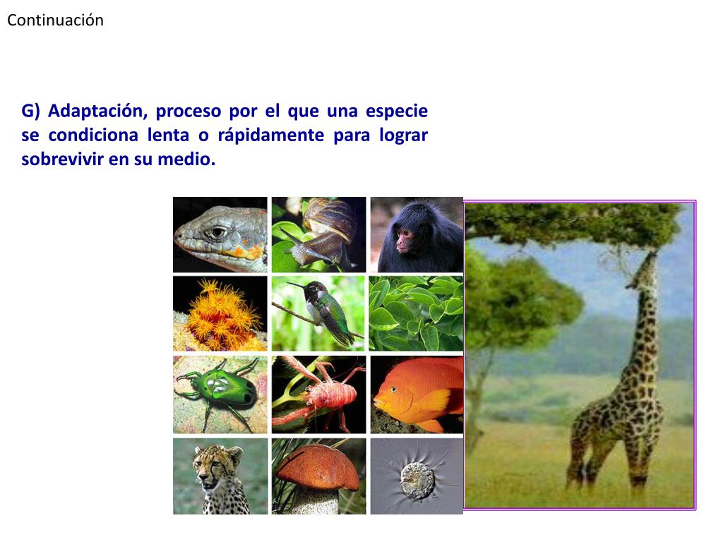 Continuación G) Adaptación, proceso por el que una especie se condiciona lenta o rápidamente para lograr sobrevivir en su medio.