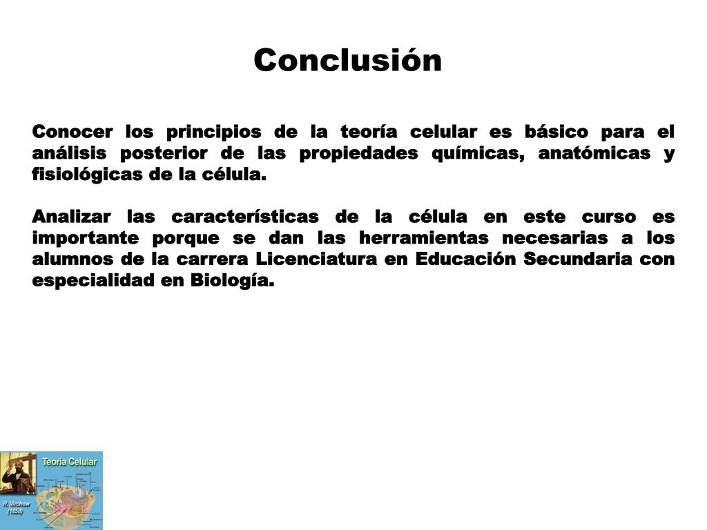 Conclusión Conocer los principios de la teoría celular es básico para el análisis posterior de las propiedades químicas, anatómicas y fisiológicas de la célula. Analizar las características de la célula en este curso es importante porque se dan las herramientas necesarias a los alumnos de la carrera Licenciatura en Educación Secundaria con especialidad en Biología.