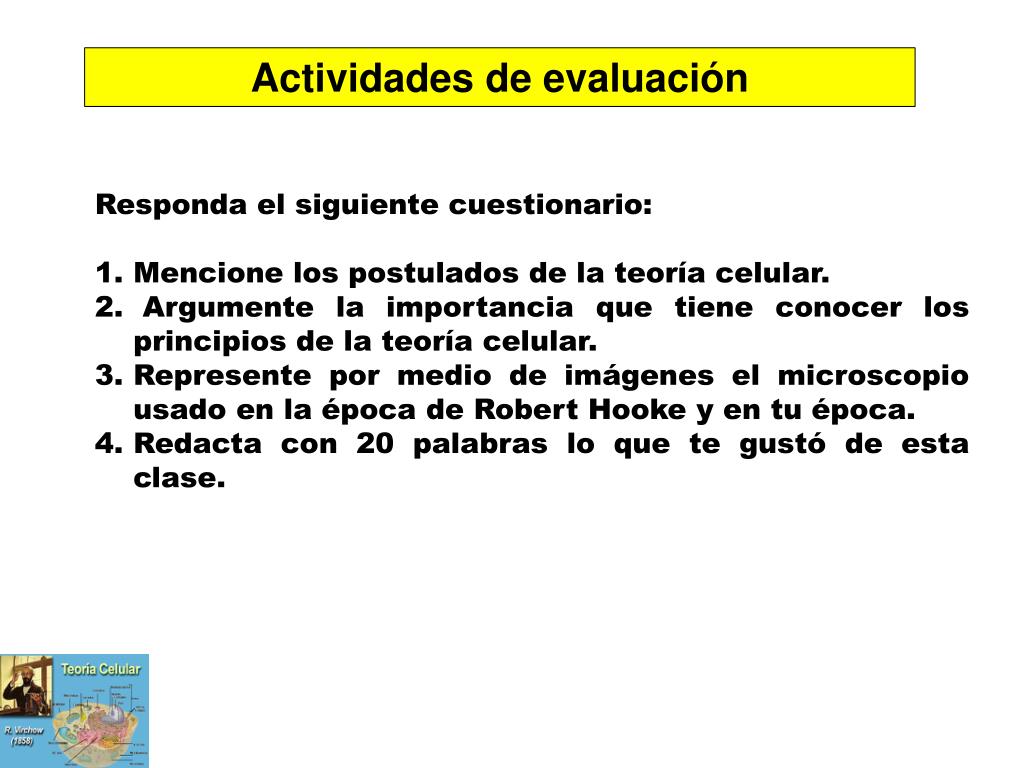 Actividades de evaluación Responda el siguiente cuestionario: Mencione los postulados de la teoría celular. Argumente la importancia que tiene conocer los principios de la teoría celular. Represente por medio de imágenes el microscopio usado en la época de Robert Hooke y en tu época. Redacta con 20 palabras lo que te gustó de esta clase.