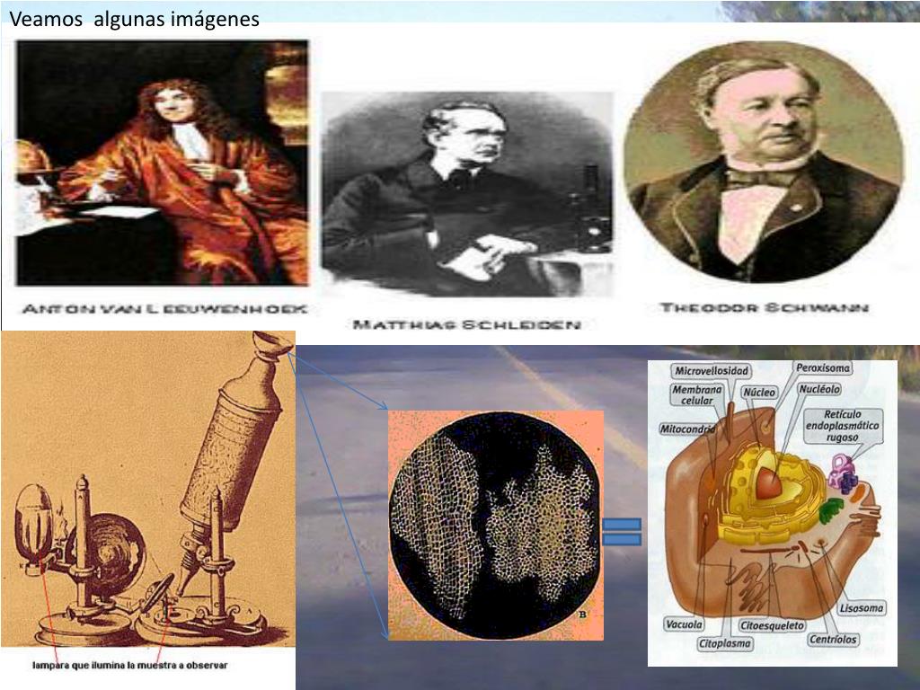 Teoríacelular Anton Van Leeuwenhoek 1673 Robert Hooke 1665 Theodor Schwann (1839) ObservaMicroorganismos de Charcas, EritrocitosHumanos y Espermatozoides MicroscopioPrimitivo Celdas = Célula “Las células son las partes elementales tanto de plantas como de animales”.