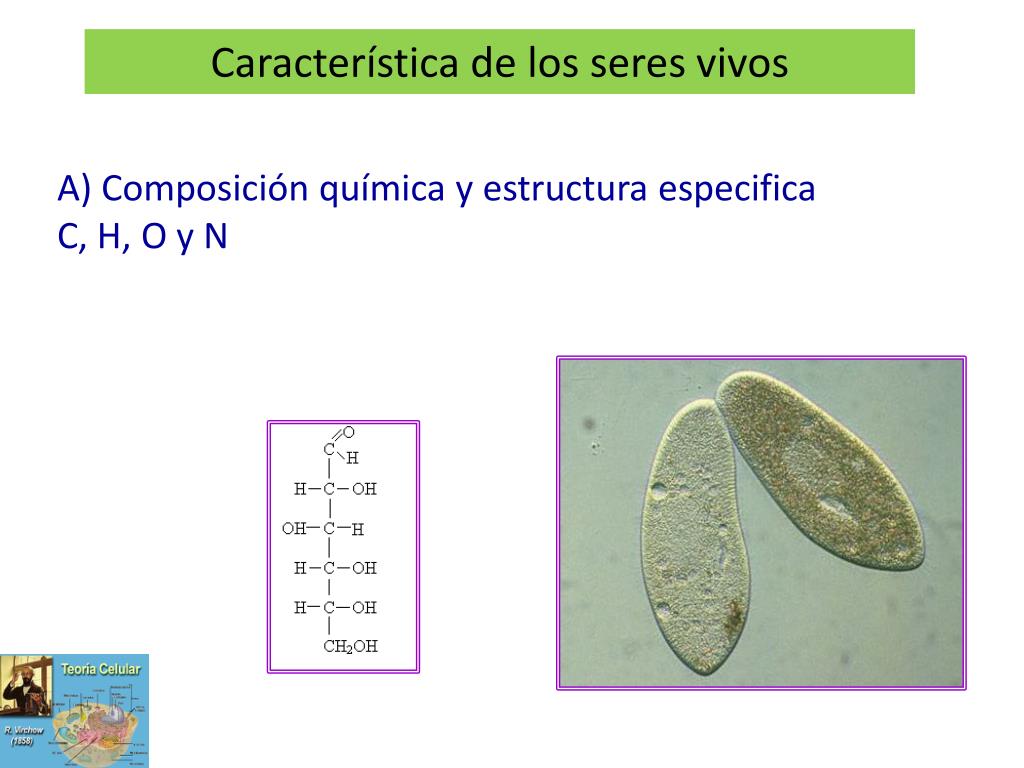 Característica de los seres vivos A) Composición química y estructura especificaC, H, O y N