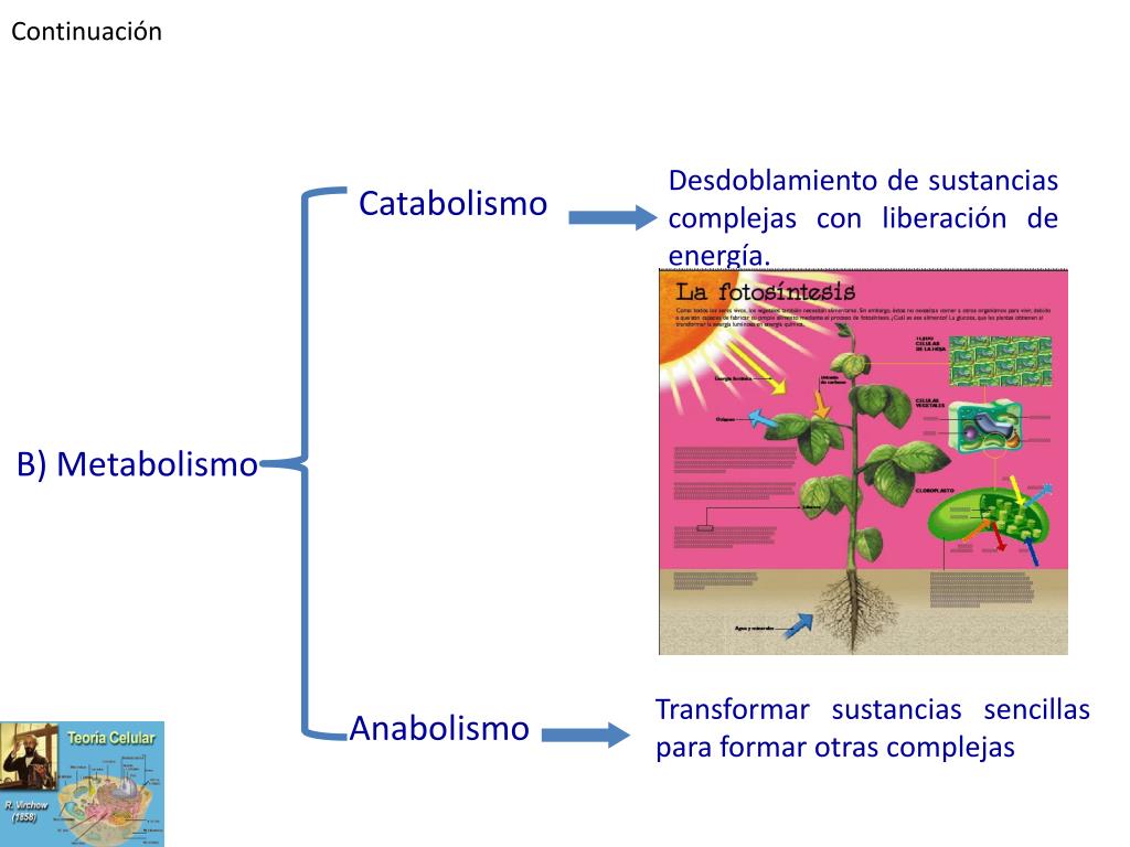 Continuación Desdoblamiento de sustancias complejas con liberación de energía. Catabolismo B) Metabolismo Transformar sustancias sencillas para formar otras complejas Anabolismo