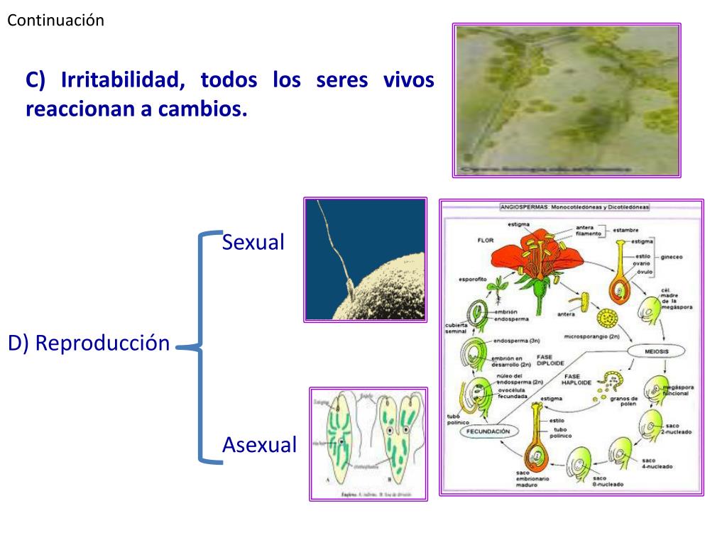 Continuación C) Irritabilidad, todos los seres vivos reaccionan a cambios. Sexual D) Reproducción Asexual