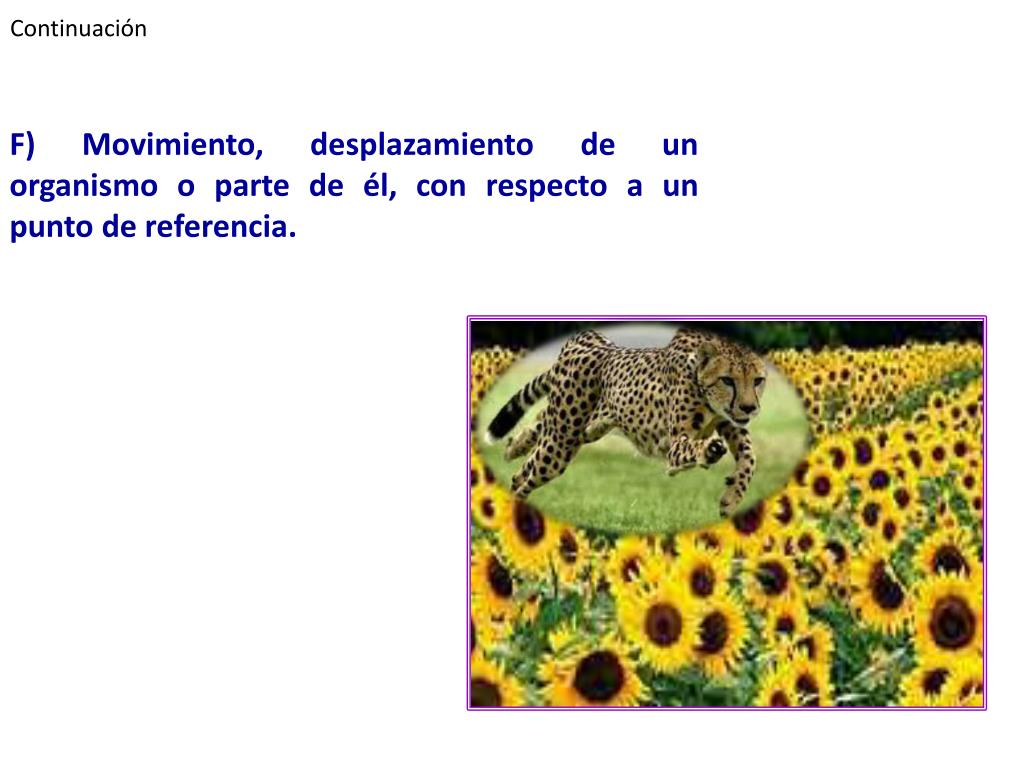Continuación F) Movimiento, desplazamiento de un organismo o parte de él, con respecto a un punto de referencia.