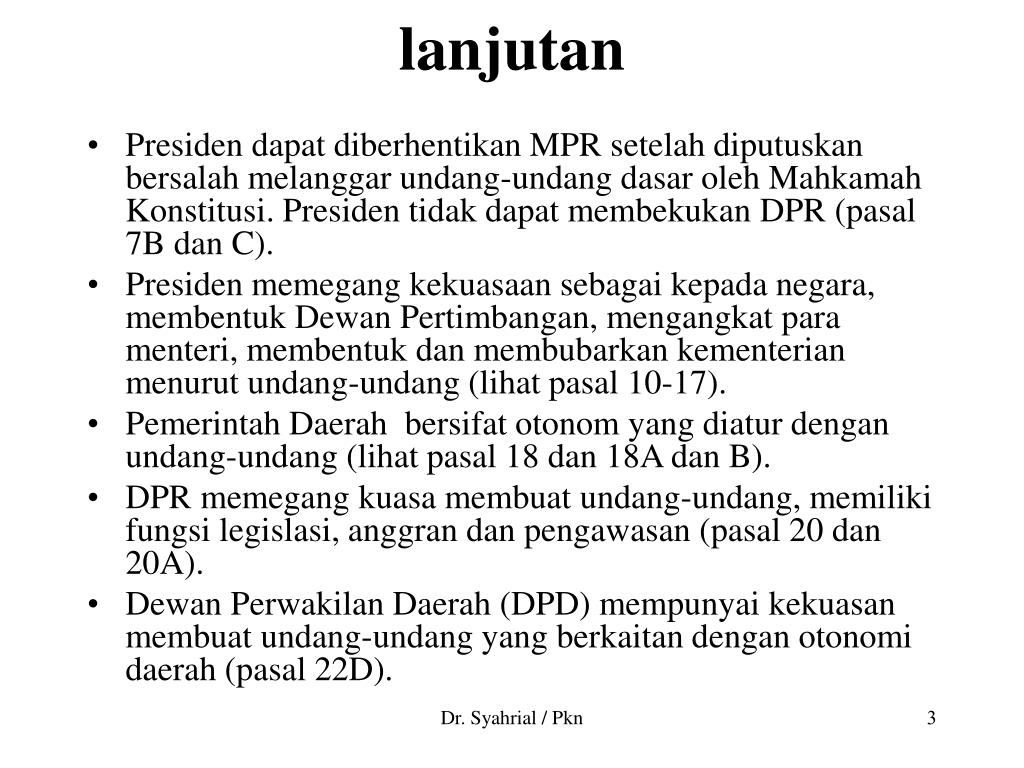 lanjutan • Presiden dapat diberhentikan MPR setelah diputuskan bersalah melanggar undang-undang dasar oleh Mahkamah Konstitusi. Presiden tidak dapat membekukan DPR (pasal 7B dan C). • Presiden memegang kekuasaan sebagai kepada negara, membentuk Dewan Pertimbangan, mengangkat para menteri, membentuk dan membubarkan kementerian menurut undang-undang (lihat pasal 10-17). • Pemerintah Daerah bersifat otonom yang diatur dengan undang-undang (lihat pasal 18 dan 18A dan B). • DPR memegang kuasa membuat undang-undang, memiliki fungsi legislasi, anggran dan pengawasan (pasal 20 dan 20A). • Dewan Perwakilan Daerah (DPD) mempunyai kekuasan membuat undang-undang yang berkaitan dengan otonomi daerah (pasal 22D). Dr. Syahrial / Pkn