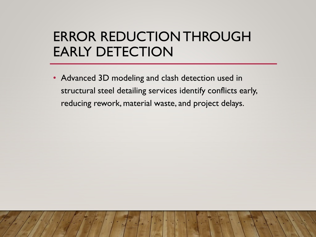 Error Reduction Through Early Detection • Advanced 3D modeling and clash detection used in structural steel detailing services identify conflicts early, reducing rework, material waste, and project delays.