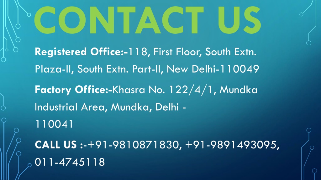 Contact us Registered Office:-118, First Floor, South Extn. Plaza-II, South Extn. Part-II, New Delhi-110049 Factory Office:-Khasra No. 122/4/1, Mundka Industrial Area, Mundka, Delhi - 110041 CALL US :-+91-9810871830, +91-9891493095, 011-4745118