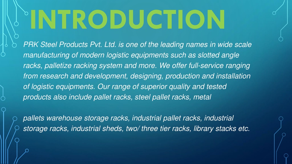 INTRODUCTION PRK Steel Products Pvt. Ltd. is one of the leading names in wide scale manufacturing of modern logistic equipments such as slotted angle racks, palletize racking system and more. We offer full-service ranging from research and development, designing, production and installation of logistic equipments. Our range of superior quality and tested products also include pallet racks, steel pallet racks, metalpallets warehouse storage racks, industrial pallet racks, industrial storage racks, industrial sheds, two/ three tier racks, library stacks etc.