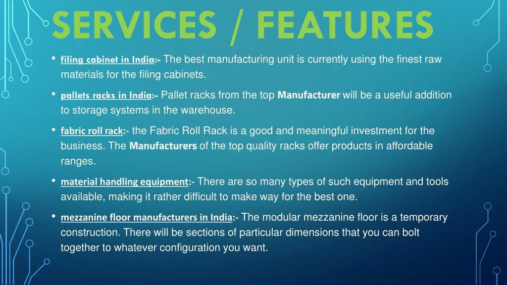 Services / features • filing cabinet in India:-The best manufacturing unit is currently using the finest raw materials for the filing cabinets. • pallets racks in India:-Pallet racks from the top Manufacturer will be a useful addition to storage systems in the warehouse. • fabric roll rack:-the Fabric Roll Rack is a good and meaningful investment for the business. The Manufacturers of the top quality racks offer products in affordable ranges. • material handling equipment:-There are so many types of such equipment and tools available, making it rather difficult to make way for the best one. • mezzanine floor manufacturers in India:-The modular mezzanine floor is a temporary construction. There will be sections of particular dimensions that you can bolt together to whatever configuration you want.