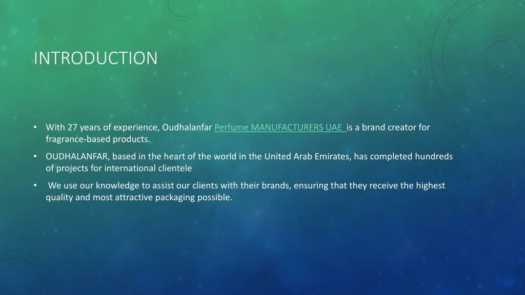 iNTRODUCTION • With 27 years of experience, OudhalanfarPerfume MANUFACTURERS UAE is a brand creator for fragrance-based products. • OUDHALANFAR, based in the heart of the world in the United Arab Emirates, has completed hundreds of projects for international clientele • We use our knowledge to assist our clients with their brands, ensuring that they receive the highest quality and most attractive packaging possible.