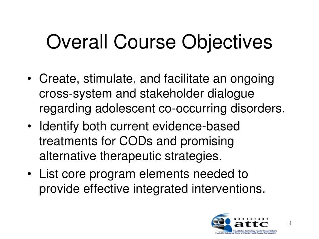Overall Course Objectives • Create, stimulate, and facilitate an ongoing cross-system and stakeholder dialogue regarding adolescent co-occurring disorders. • Identify both current evidence-based treatments for CODs and promising alternative therapeutic strategies. • List core program elements needed to provide effective integrated interventions.