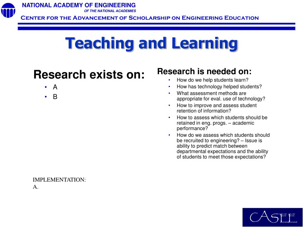 Research exists on: A B Research is needed on: How do we help students learn? How has technology helped students? What assessment methods are appropriate for eval. use of technology? How to improve and assess student retention of information? How to assess which students should be retained in eng. progs. – academic performance? How do we assess which students should be recruited to engineering? – Issue is ability to predict match between departmental expectations and the ability of students to meet those expectations? Teaching and Learning IMPLEMENTATION: A.
