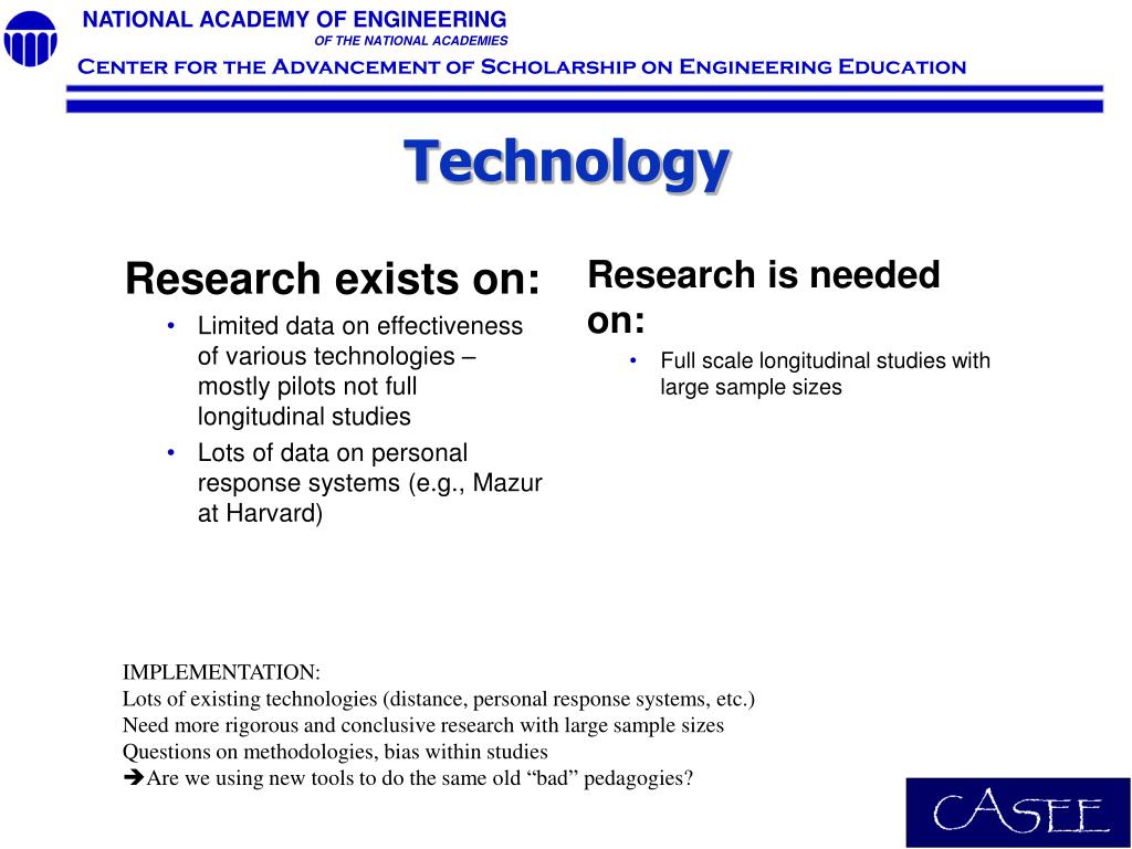Research exists on: Limited data on effectiveness of various technologies – mostly pilots not full longitudinal studies Lots of data on personal response systems (e.g., Mazur at Harvard) Research is needed on: Full scale longitudinal studies with large sample sizes Technology IMPLEMENTATION: Lots of existing technologies (distance, personal response systems, etc.) Need more rigorous and conclusive research with large sample sizes Questions on methodologies, bias within studies Are we using new tools to do the same old “bad” pedagogies?