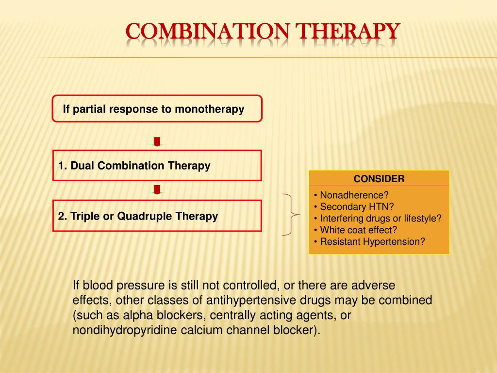 1. Dual Combination Therapy • CONSIDER • Nonadherence? • Secondary HTN? • Interfering drugs or lifestyle? • White coat effect? • Resistant Hypertension? 2. Triple or Quadruple Therapy Combination Therapy If partial response to monotherapy If blood pressure is still not controlled, or there are adverse effects, other classes of antihypertensive drugs may be combined (such as alpha blockers, centrally acting agents, or nondihydropyridine calcium channel blocker).