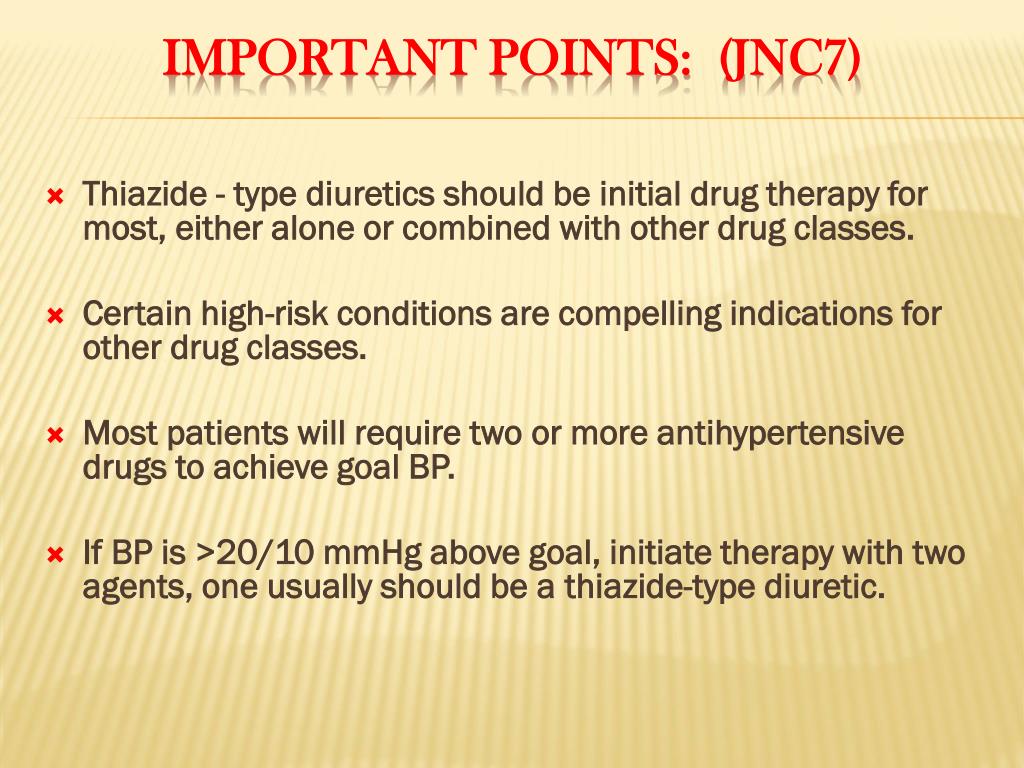 Thiazide - type diuretics should be initial drug therapy for most, either alone or combined with other drug classes. • Certain high-risk conditions are compelling indications for other drug classes. • Most patients will require two or more antihypertensive drugs to achieve goal BP. • If BP is >20/10 mmHg above goal, initiate therapy with two agents, one usually should be a thiazide-type diuretic. Important Points: (JNC7)