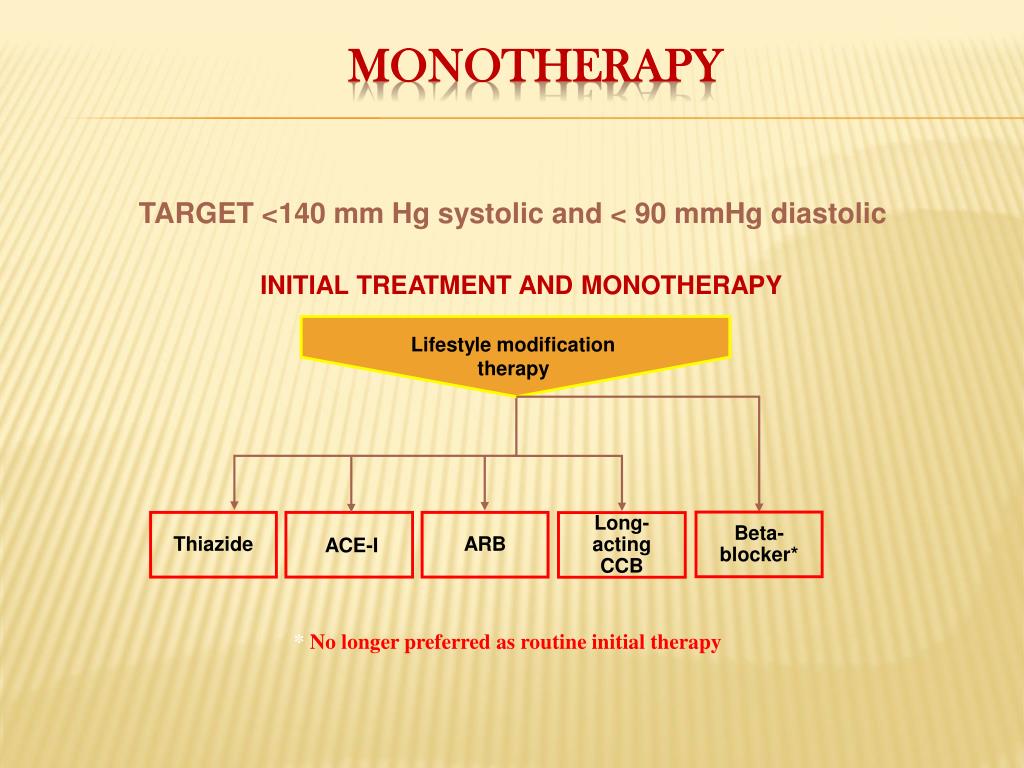 ARB ACE-I monotherapy TARGET <140 mm Hg systolic and < 90 mmHg diastolic INITIAL TREATMENT AND MONOTHERAPY Lifestyle modification therapy Beta-blocker* Thiazide Long-acting CCB * No longer preferred as routine initial therapy
