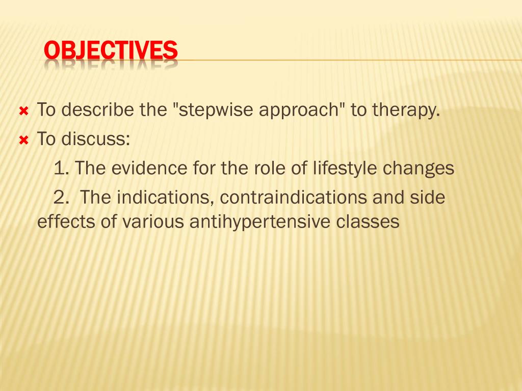 To describe the "stepwise approach" to therapy. To discuss: 1. The evidence for the role of lifestyle changes 2. The indications, contraindications and side effects of various antihypertensive classes Objectives