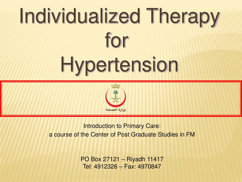 Individualized Therapy for Hypertension. Introduction to Primary Care: a course of the Center of Post Graduate Studies i n FM. PO Box 27121 – Riyadh 11417 Tel: 4912326 – Fax: 4970847. 1. To describe the "step wise approach" to therapy. To discuss: