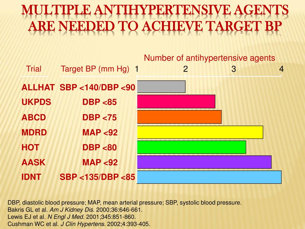 Multiple Antihypertensive Agents Are Needed to Achieve Target BP UKPDS DBP <85 ABCD DBP <75 MDRD MAP <92 HOT DBP <80 AASK MAP <92 IDNT SBP <135/DBP <85 ALLHAT SBP <140/DBP <90 Number of antihypertensive agents Trial Target BP (mm Hg) 1 2 3 4 DBP, diastolic blood pressure; MAP, mean arterial pressure; SBP, systolic blood pressure. Bakris GL et al. Am J Kidney Dis. 2000;36:646-661. Lewis EJ et al. N Engl J Med. 2001;345:851-860. Cushman WC et al. J Clin Hypertens. 2002;4:393-405.