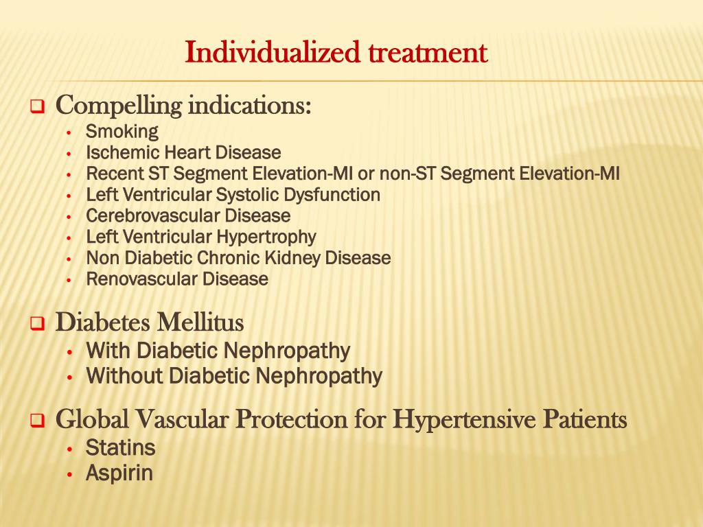 Individualized treatment • Compelling indications: • Smoking • Ischemic Heart Disease • Recent ST Segment Elevation-MI or non-ST Segment Elevation-MI • Left Ventricular Systolic Dysfunction • Cerebrovascular Disease • Left Ventricular Hypertrophy • Non Diabetic Chronic Kidney Disease • Renovascular Disease • Diabetes Mellitus • With Diabetic Nephropathy • Without Diabetic Nephropathy • Global Vascular Protection for Hypertensive Patients • Statins • Aspirin