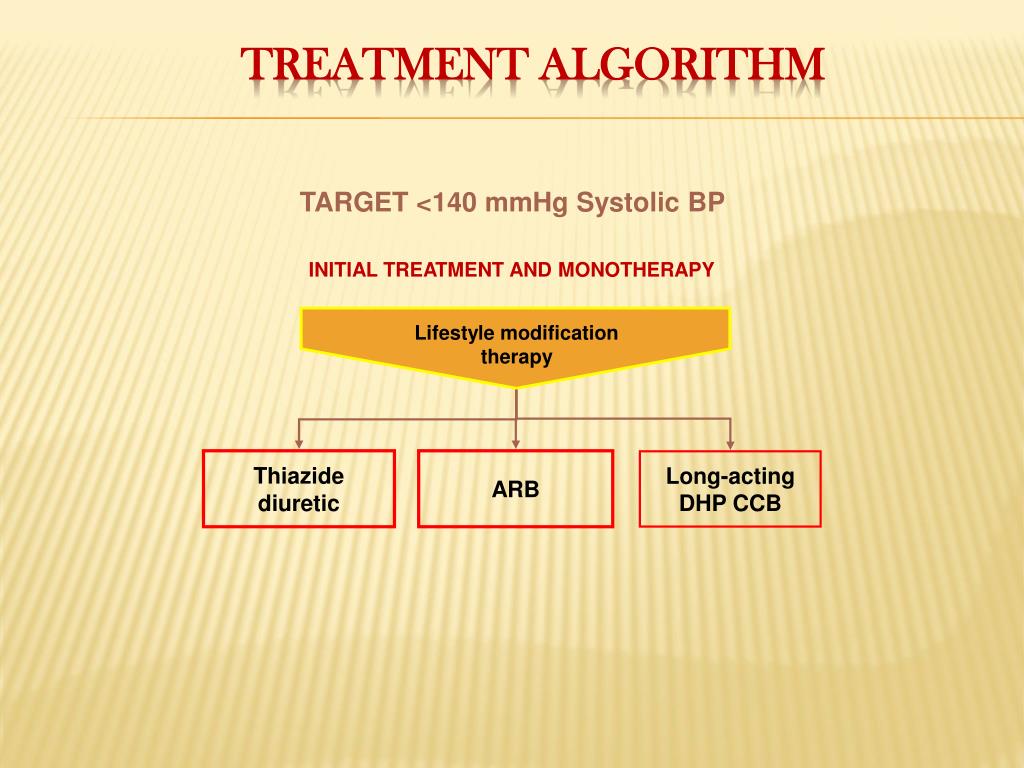 Lifestyle modification therapy Thiazide diuretic ARB Long-acting DHP CCB Treatment Algorithm TARGET <140 mmHg Systolic BP INITIAL TREATMENT AND MONOTHERAPY