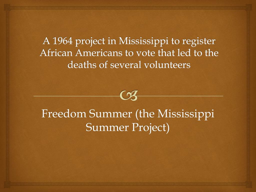 A 1964 project in Mississippi to register African Americans to vote that led to the deaths of several volunteers Freedom Summer (the Mississippi Summer Project)