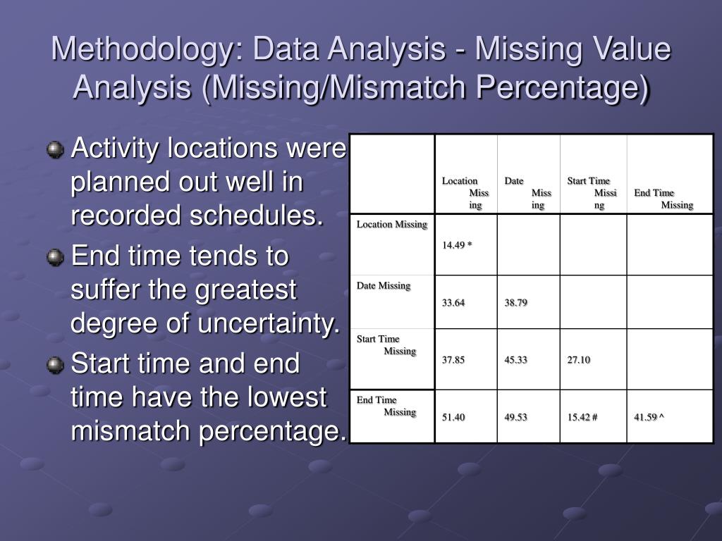 Methodology: Data Analysis - Missing Value Analysis (Missing/Mismatch Percentage) • Activity locations were planned out well in recorded schedules. • End time tends to suffer the greatest degree of uncertainty. • Start time and end time have the lowest mismatch percentage.
