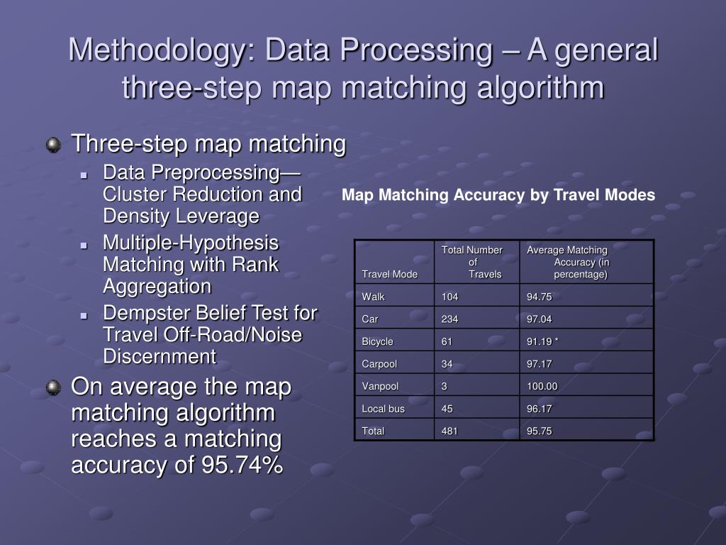 Methodology: Data Processing – A general three-step map matching algorithm • Three-step map matching • Data Preprocessing—Cluster Reduction and Density Leverage • Multiple-Hypothesis Matching with Rank Aggregation • Dempster Belief Test for Travel Off-Road/Noise Discernment • On average the map matching algorithm reaches a matching accuracy of 95.74% Map Matching Accuracy by Travel Modes