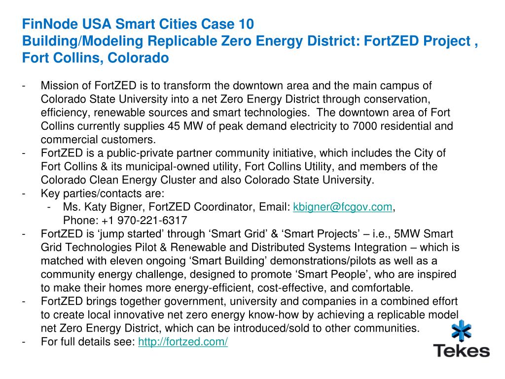 FinNode USA Smart Cities Case 10Building/Modeling Replicable Zero Energy District: FortZED Project , Fort Collins, Colorado • Mission of FortZED is to transform the downtown area and the main campus of Colorado State University into a net Zero Energy District through conservation, efficiency, renewable sources and smart technologies. The downtown area of Fort Collins currently supplies 45 MW of peak demand electricity to 7000 residential and commercial customers. • FortZED is a public-private partner community initiative, which includes the City of Fort Collins & its municipal-owned utility, Fort Collins Utility, and members of the Colorado Clean Energy Cluster and also Colorado State University. • Key parties/contacts are: • Ms. Katy Bigner, FortZED Coordinator, Email: kbigner@fcgov.com, Phone: +1 970-221-6317 • FortZED is ‘jump started’ through ‘Smart Grid’ & ‘Smart Projects’ – i.e., 5MW Smart Grid Technologies Pilot & Renewable and Distributed Systems Integration – which is matched with eleven ongoing ‘Smart Building’ demonstrations/pilots as well as a community energy challenge, designed to promote ‘Smart People’, who are inspired to make their homes more energy-efficient, cost-effective, and comfortable. • FortZED brings together government, university and companies in a combined effort to create local innovative net zero energy know-how by achieving a replicable model net Zero Energy District, which can be introduced/sold to other communities. • For full details see: http://fortzed.com/