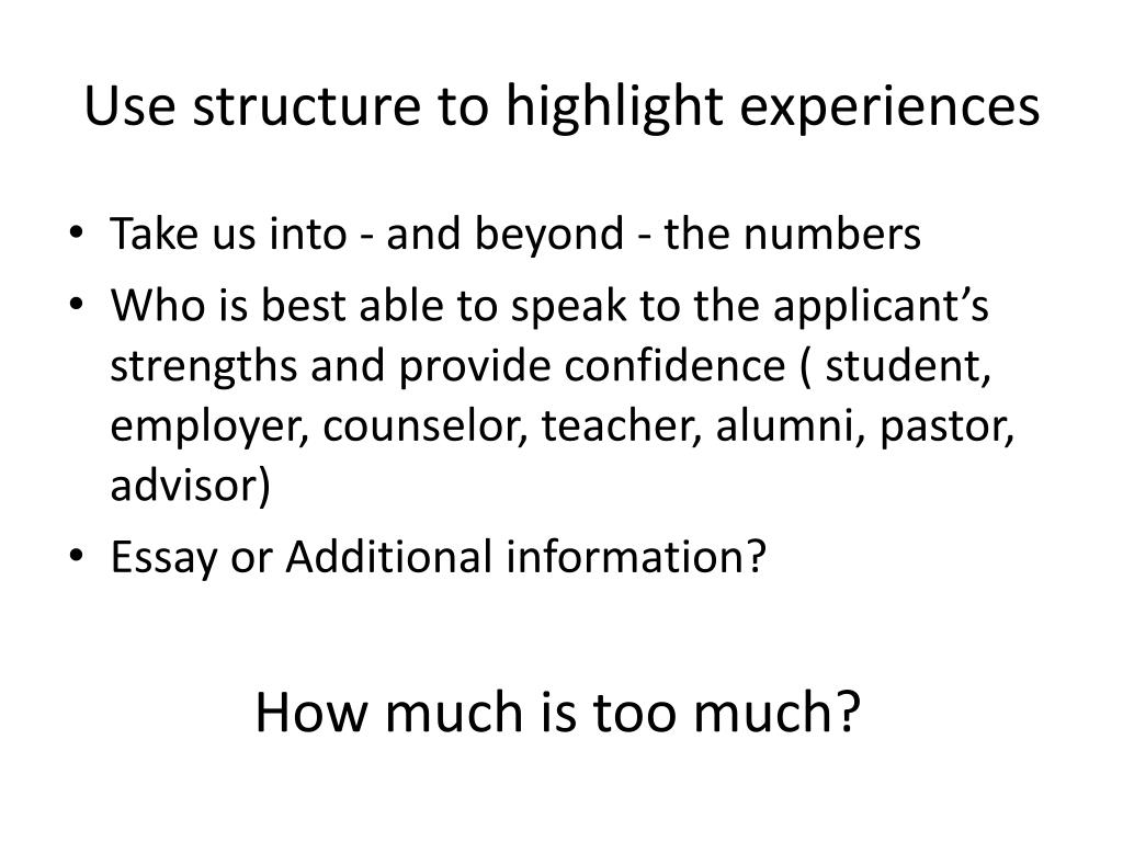 Use structure to highlight experiences • Take us into - and beyond - the numbers • Who is best able to speak to the applicant’s strengths and provide confidence ( student, employer, counselor, teacher, alumni, pastor, advisor) • Essay or Additional information? How much is too much?
