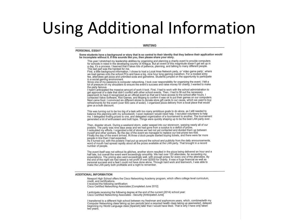 Be Concise Don’t bury important information Readers are reviewing many applications • Provide context to GPA and academic rigor. • If a learning disability has impacted test scores, ideally the reader learns that before reading a teacher evaluation. Give confidence that a student can advocate and overcome challenges.