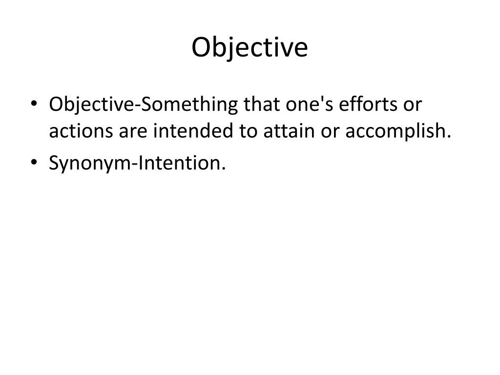 Objective • Objective-Something that one's efforts or actions are intended to attain or accomplish. • Synonym-Intention.