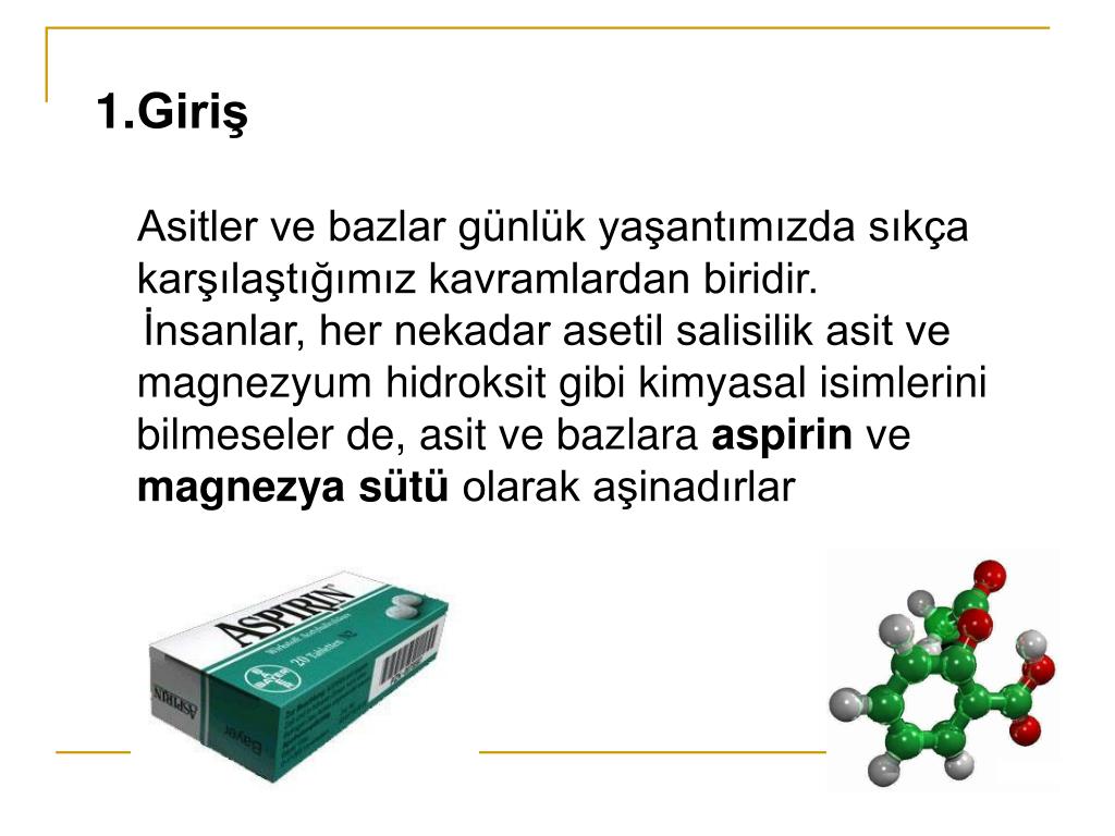 Giriş • Asitler ve bazlar günlük yaşantımızda sıkça karşılaştığımız kavramlardan biridir. • İnsanlar, her nekadar asetil salisilik asit ve magnezyum hidroksit gibi kimyasal isimlerini bilmeseler de, asit ve bazlara aspirin ve magnezya sütü olarak aşinadırlar