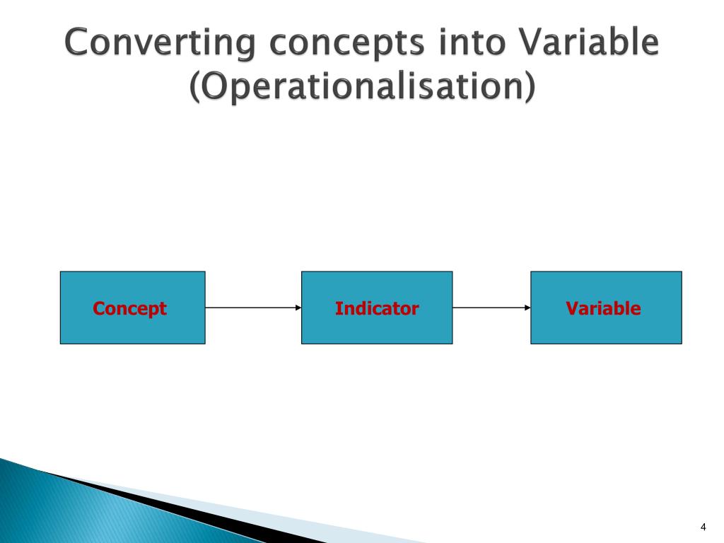 Converting concepts into Variable (Operationalisation) Concept Indicator Variable