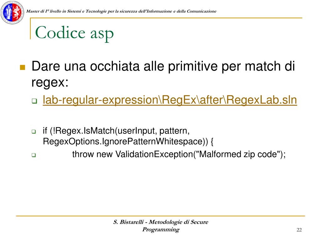 Codice asp • Dare una occhiata alle primitive per match di regex: • lab-regular-expression\RegEx\after\RegexLab.sln • if (!Regex.IsMatch(userInput, pattern, RegexOptions.IgnorePatternWhitespace)) { • throw new ValidationException("Malformed zip code"); S. Bistarelli - Metodologie di Secure Programming