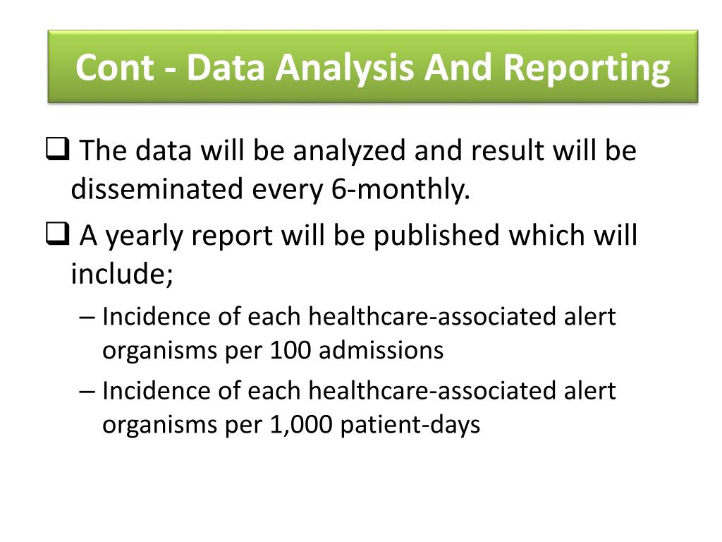 Data Analysis And ReportingData Analysis And Reporting • Cont - Data Analysis And Reporting • The data will be analyzed and result will be disseminated every 6-monthly. • A yearly report will be published which will include; • Incidence of each healthcare-associated alert organisms per 100 admissions • Incidence of each healthcare-associated alert organisms per 1,000 patient-days
