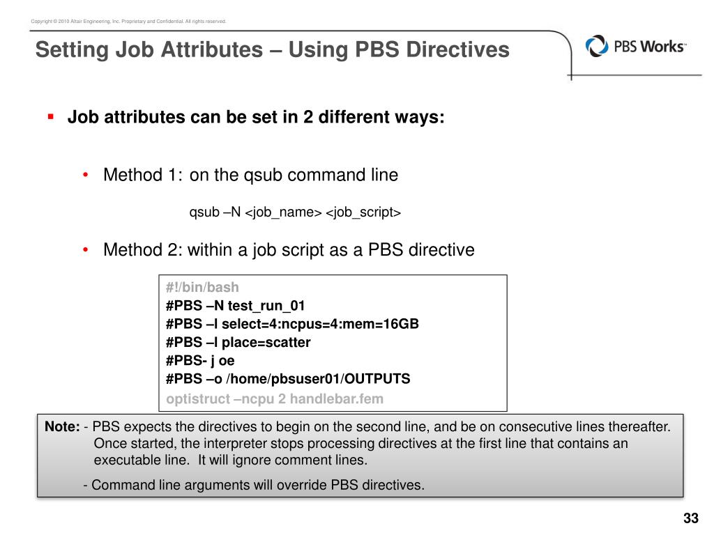 Setting Job Attributes – Using PBS Directives • Job attributes can be set in 2 different ways: • Method 1: on the qsub command line qsub –N <job_name> <job_script> • Method 2: within a job script as a PBS directive #!/bin/bash #PBS –N test_run_01 #PBS –l select=4:ncpus=4:mem=16GB #PBS –l place=scatter #PBS- j oe #PBS –o /home/pbsuser01/OUTPUTS optistruct –ncpu 2 handlebar.fem Note: - PBS expects the directives to begin on the second line, and be on consecutive lines thereafter. Once started, the interpreter stops processing directives at the first line that contains an executable line. It will ignore comment lines. - Command line arguments will override PBS directives.