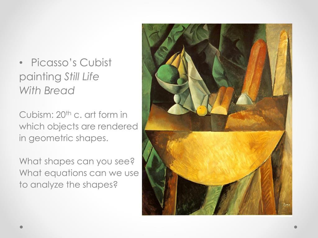 Picasso’s Cubist painting Still Life With Bread Cubism: 20th c. art form in which objects are rendered in geometric shapes. What shapes can you see? What equations can we use to analyze the shapes?
