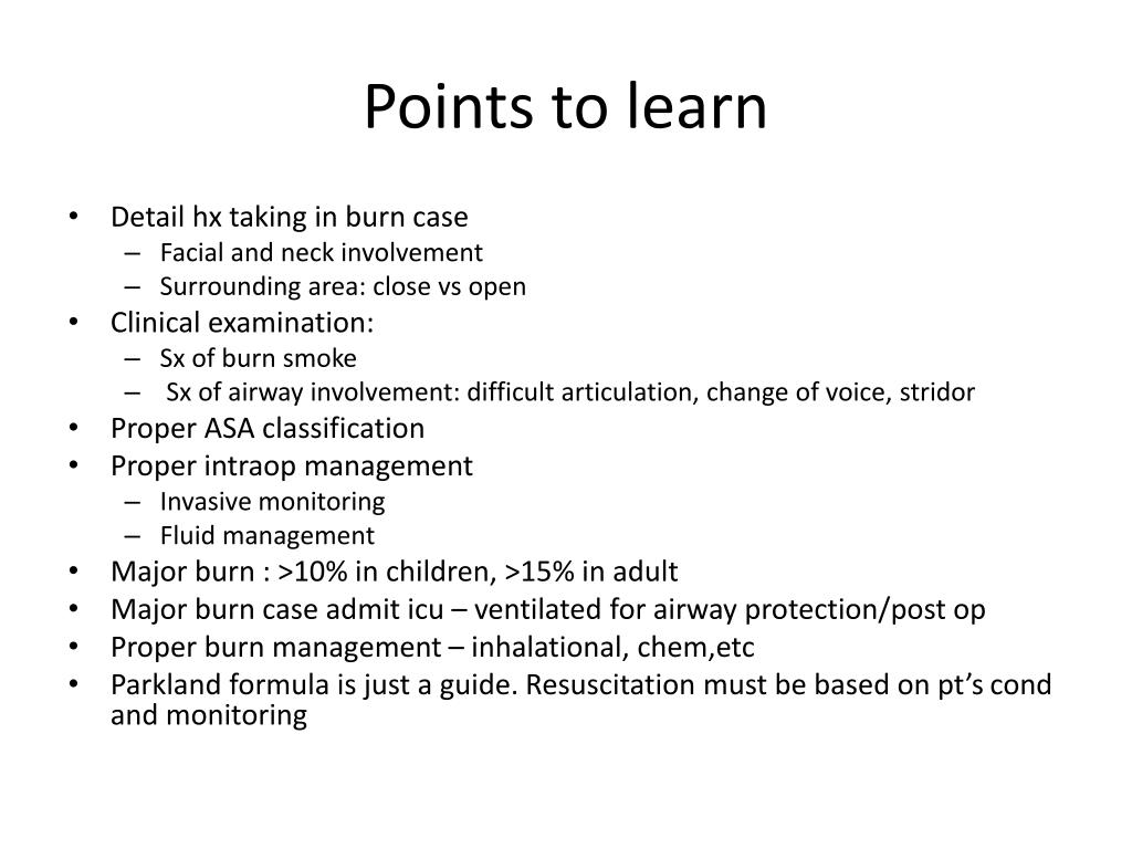 Points to learn • Detail hx taking in burn case • Facial and neck involvement • Surrounding area: close vs open • Clinical examination: • Sx of burn smoke • Sx of airway involvement: difficult articulation, change of voice, stridor • Proper ASA classification • Proper intraop management • Invasive monitoring • Fluid management • Major burn : >10% in children, >15% in adult • Major burn case admit icu – ventilated for airway protection/post op • Proper burn management – inhalational, chem,etc • Parkland formula is just a guide. Resuscitation must be based on pt’s cond and monitoring