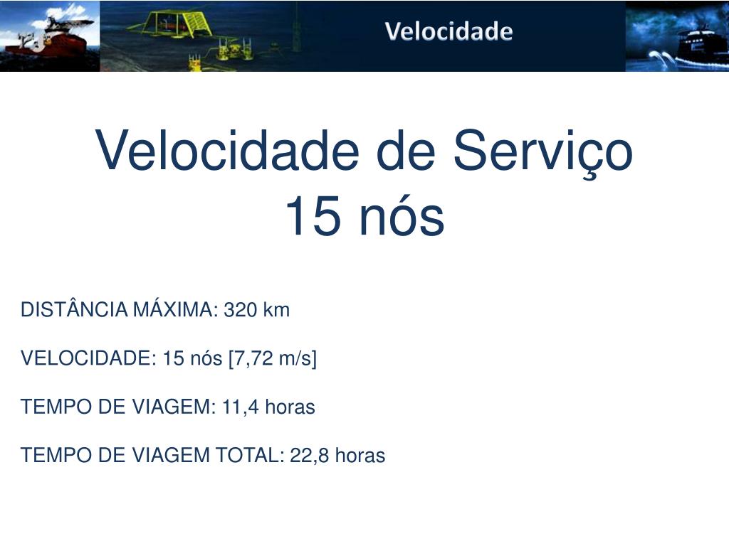 Velocidade Velocidade de Serviço15 nós DISTÂNCIA MÁXIMA: 320 km VELOCIDADE: 15 nós [7,72 m/s] TEMPO DE VIAGEM: 11,4 horas TEMPO DE VIAGEM TOTAL: 22,8 horas