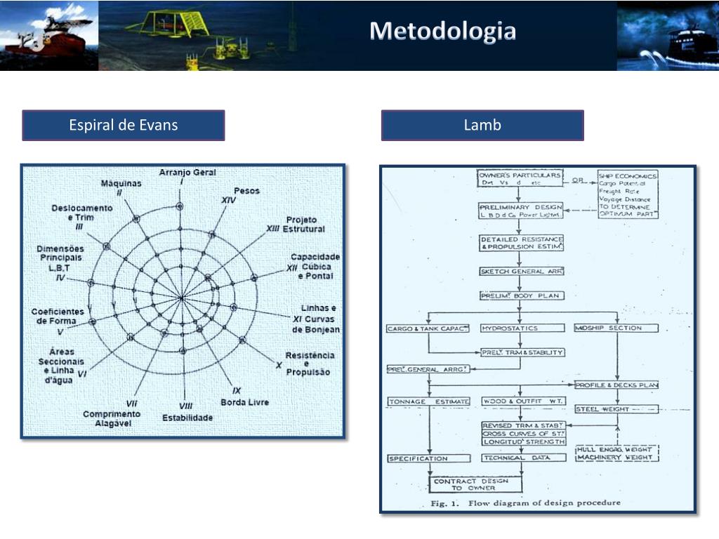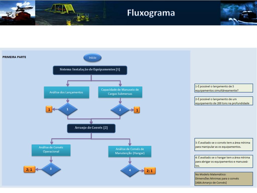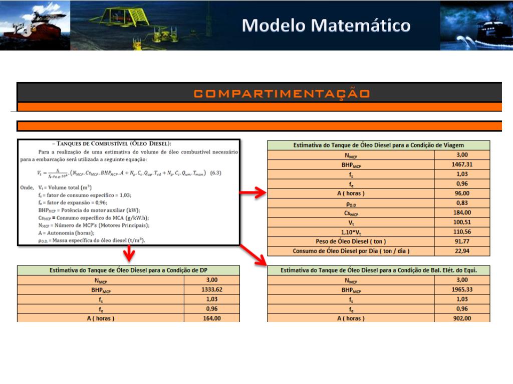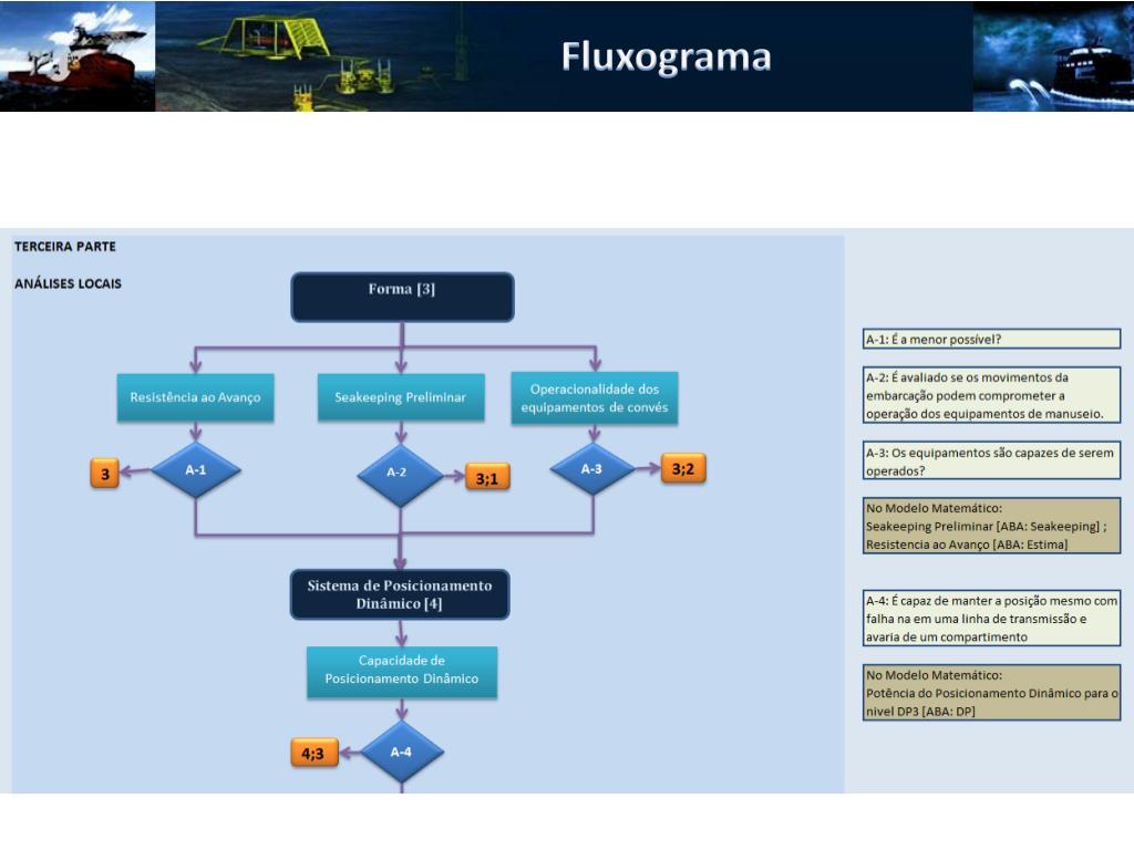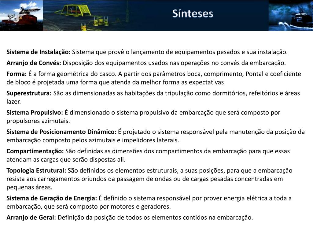 Sínteses Sistema de Instalação: Sistema que provê o lançamento de equipamentos pesados e sua instalação. Arranjo de Convés:Disposição dos equipamentos usados nas operações no convés da embarcação. Forma: É a forma geométrica do casco. A partir dos parâmetros boca, comprimento, Pontal e coeficiente de bloco é projetada uma forma que atenda da melhor forma as expectativas Superestrutura: São as dimensionadas as habitações da tripulação como dormitórios, refeitórios e áreas lazer. Sistema Propulsivo: É dimensionado o sistema propulsivo da embarcação que será composto por propulsores azimutais. Sistema de Posicionamento Dinâmico: É projetado o sistema responsável pela manutenção da posição da embarcação composto pelos azimutais e impelidores laterais. Compartimentação: São definidas as dimensões dos compartimentos da embarcação para que essas atendam as cargas que serão dispostas ali. Topologia Estrutural: São definidos os elementos estruturais, a suas posições, para que a embarcação resista aos carregamentos oriundos da passagem de ondas ou de cargas pesadas concentradas em pequenas áreas. Sistema de Geração de Energia: É definido o sistema responsável por prover energia elétrica a toda a embarcação, que será composto por motores e geradores. Arranjo de Geral: Definição da posição de todos os elementos contidos na embarcação.