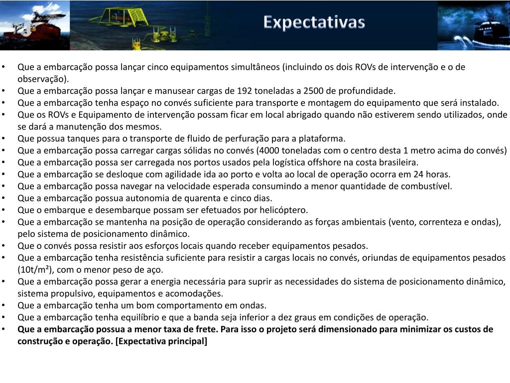 Expectativas • Que a embarcação possa lançar cinco equipamentos simultâneos (incluindo os dois ROVs de intervenção e o de observação). • Que a embarcação possa lançar e manusear cargas de 192 toneladas a 2500 de profundidade. • Que a embarcação tenha espaço no convés suficiente para transporte e montagem do equipamento que será instalado. • Que os ROVs e Equipamento de intervenção possam ficar em local abrigado quando não estiverem sendo utilizados, onde se dará a manutenção dos mesmos. • Que possua tanques para o transporte de fluido de perfuração para a plataforma. • Que a embarcação possa carregar cargas sólidas no convés (4000 toneladas com o centro desta 1 metro acima do convés) • Que a embarcação possa ser carregada nos portos usados pela logística offshore na costa brasileira. • Que a embarcação se desloque com agilidade ida ao porto e volta ao local de operação ocorra em 24 horas. • Que a embarcação possa navegar na velocidade esperada consumindo a menor quantidade de combustível. • Que a embarcação possua autonomia de quarenta e cinco dias. • Que o embarque e desembarque possam ser efetuados por helicóptero. • Que a embarcação se mantenha na posição de operação considerando as forças ambientais (vento, correnteza e ondas), pelo sistema de posicionamento dinâmico. • Que o convés possa resistir aos esforços locais quando receber equipamentos pesados. • Que a embarcação tenha resistência suficiente para resistir a cargas locais no convés, oriundas de equipamentos pesados (10t/m²), com o menor peso de aço. • Que a embarcação possa gerar a energia necessária para suprir as necessidades do sistema de posicionamento dinâmico, sistema propulsivo, equipamentos e acomodações. • Que a embarcação tenha um bom comportamento em ondas. • Que a embarcação tenha equilíbrio e que a banda seja inferior a dez graus em condições de operação. • Que a embarcação possua a menor taxa de frete. Para isso o projeto será dimensionado para minimizar os custos de construção e operação. [Expectativa principal]