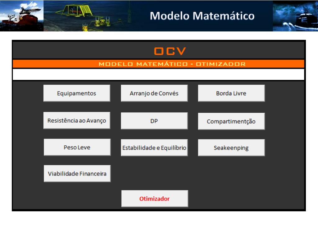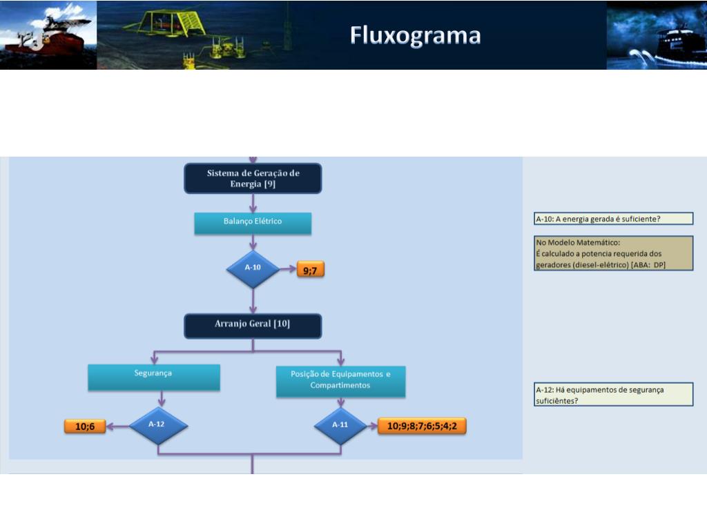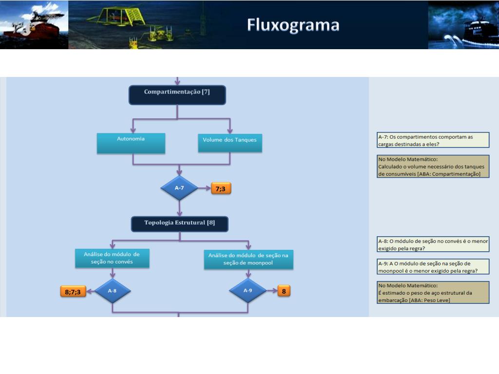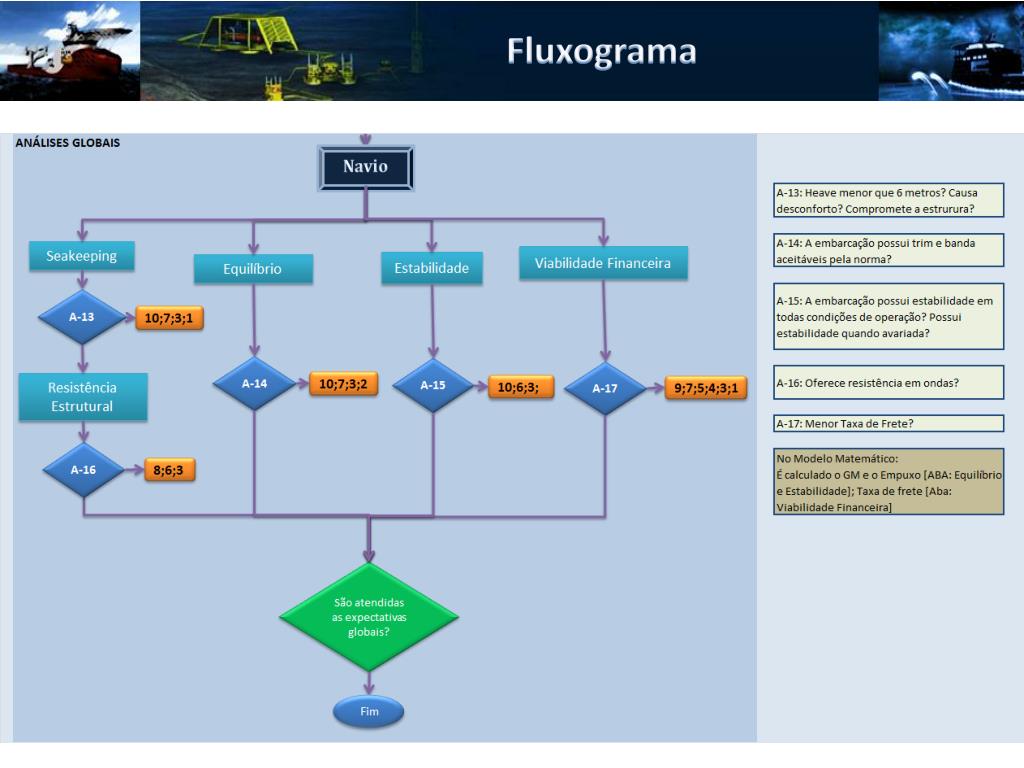Elementos de Análise • Elementos de Análise • Análise dos Lançamentos • Capacidade de Manuseio dos Equipamentos • Análise do Convés de Operação • Análise do Hangar • Operacionalidade dos Equipamentos de Convés • Volume dos Compartimentos • Posicionamento Dinâmico • Resistência ao Avanço • Autonomia • Módulo de Seção • Análise do Módulo de Seção na Seção de Moonpool • Resistência Estrutural • Balanço Elétrico • Eficiência Propulsiva • Segurança • Posição dos Equipamentos e compartimentos • Estabilidade • Equilíbrio • Seakeeping Global • Habitabilidade • Viabilidade Financeira