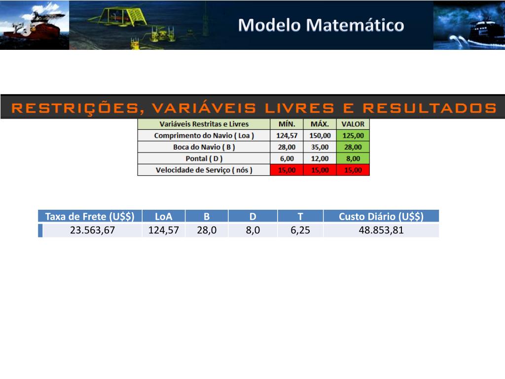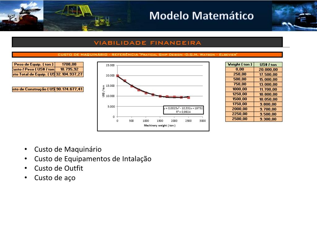 Modelo Matemático • Custo de Maquinário • Custo de Equipamentos de Intalação • Custo de Outfit • Custo de aço