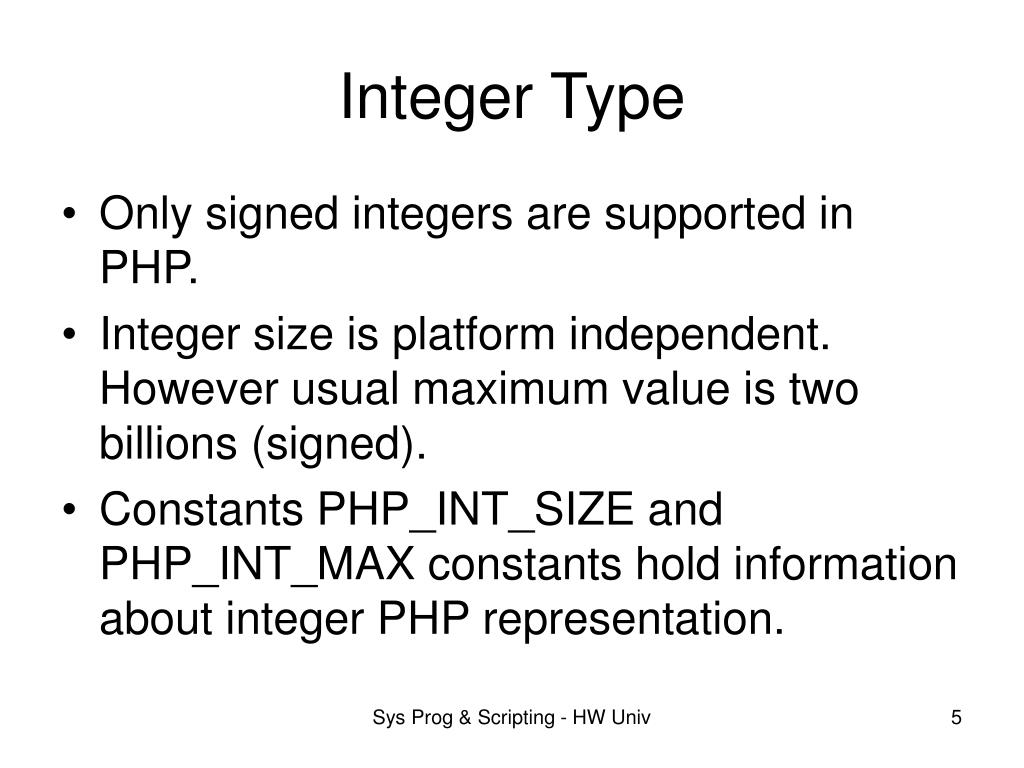 Sys Prog & Scripting - HW Univ Integer Type • Only signed integers are supported in PHP. • Integer size is platform independent. However usual maximum value is two billions (signed). • Constants PHP_INT_SIZE and PHP_INT_MAX constants hold information about integer PHP representation.