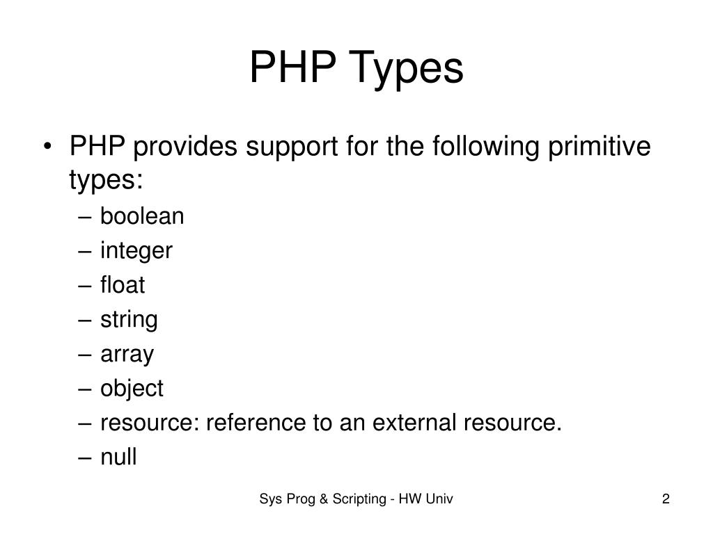 Sys Prog & Scripting - HW Univ PHP Types • PHP provides support for the following primitive types: • boolean • integer • float • string • array • object • resource: reference to an external resource. • null