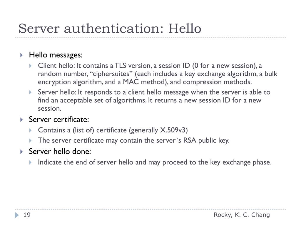 Server authentication: Hello • Hello messages: • Client hello: It contains a TLS version, a session ID (0 for a new session), a random number, “ciphersuites” (each includes a key exchange algorithm, a bulk encryption algorithm, and a MAC method), and compression methods. • Server hello: It responds to a client hello message when the server is able to find an acceptable set of algorithms. It returns a new session ID for a new session. • Server certificate: • Contains a (list of) certificate (generally X.509v3) • The server certificate may contain the server’s RSA public key. • Server hello done: • Indicate the end of server hello and may proceed to the key exchange phase.